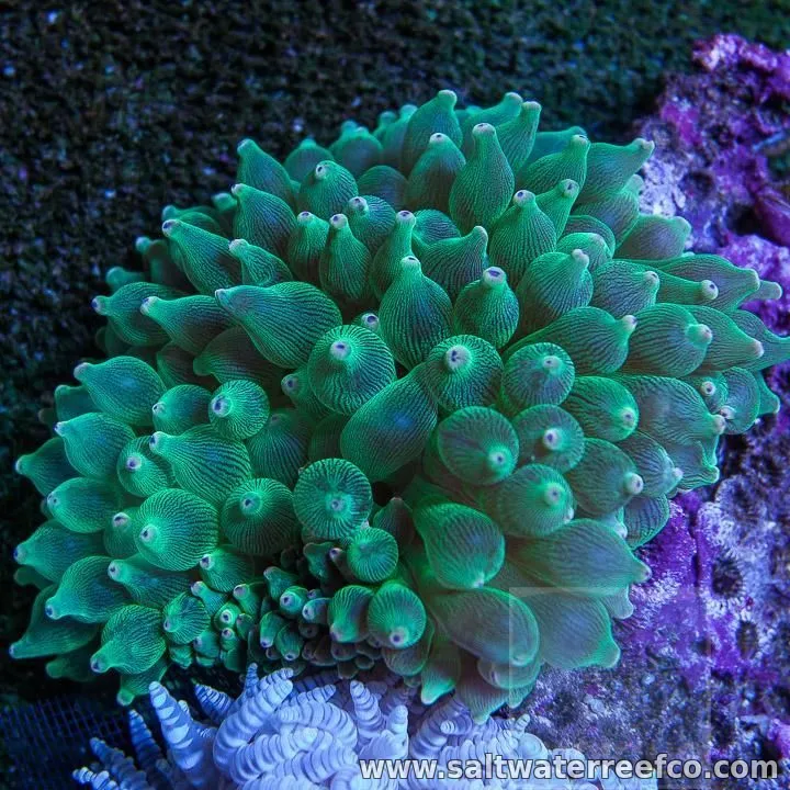 The Green Bubble Tip Anemone is ideal for established reef tanks with plenty of rocks to attach to. It has bulb-shaped tentacles that extend to catch food and retract afterward. It needs at least a 30-gallon tank with strong lighting to stay healthy and avoid stretching. These anemones can grow up to 12 inches wide but usually stay smaller. They do well with clownfish, which help feed them, or you can supplement their diet with chopped fish, shrimp, or worms. Handle carefully, as they can sting and harm nearby tank mates if crowded.
