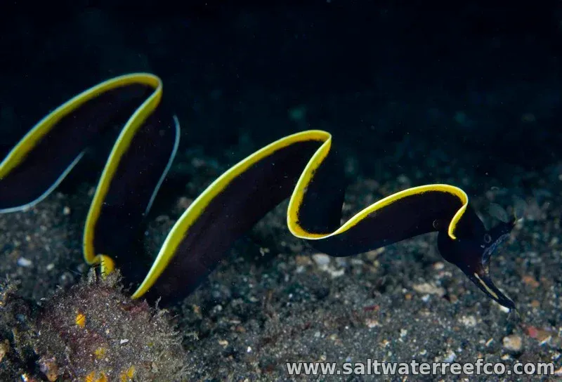 The Black Ribbon Eel is a striking species featuring an elongated black body with a yellow dorsal fin in juveniles. It requires a 100+ gallon aquarium with 4–5 inches of sand for burrowing and a secure lid. Provide caves or buried PVC pipe for refuge. Feed live fish, crab, or shrimp; this eel prefers solitary feeding. 26–30 inches. Expert care recommended.